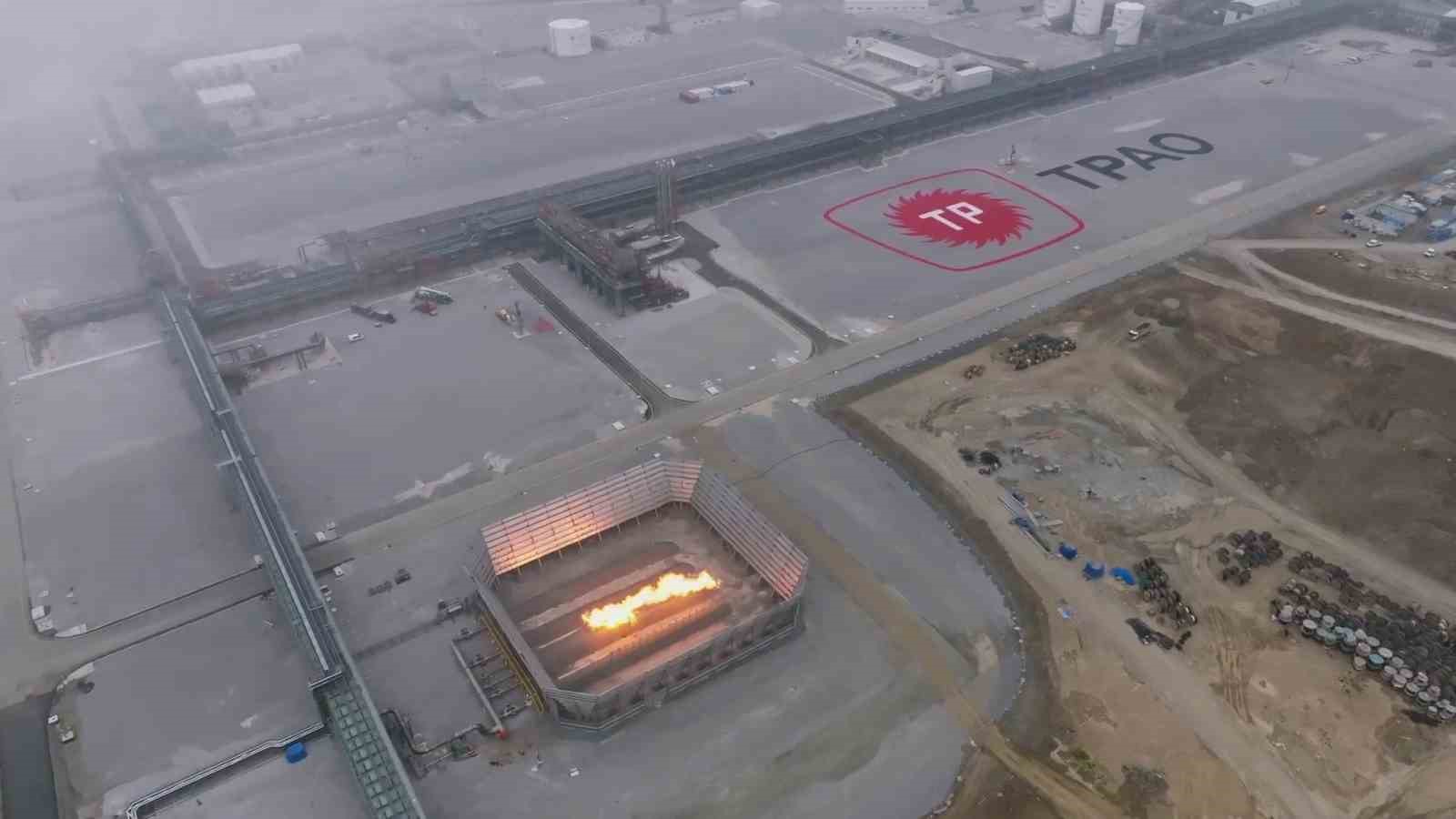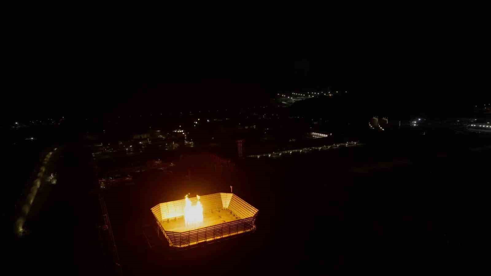 Karaya ulaşan gazın test odasındaki yanma görüntüleri de dron ile havadan görüntülendi.