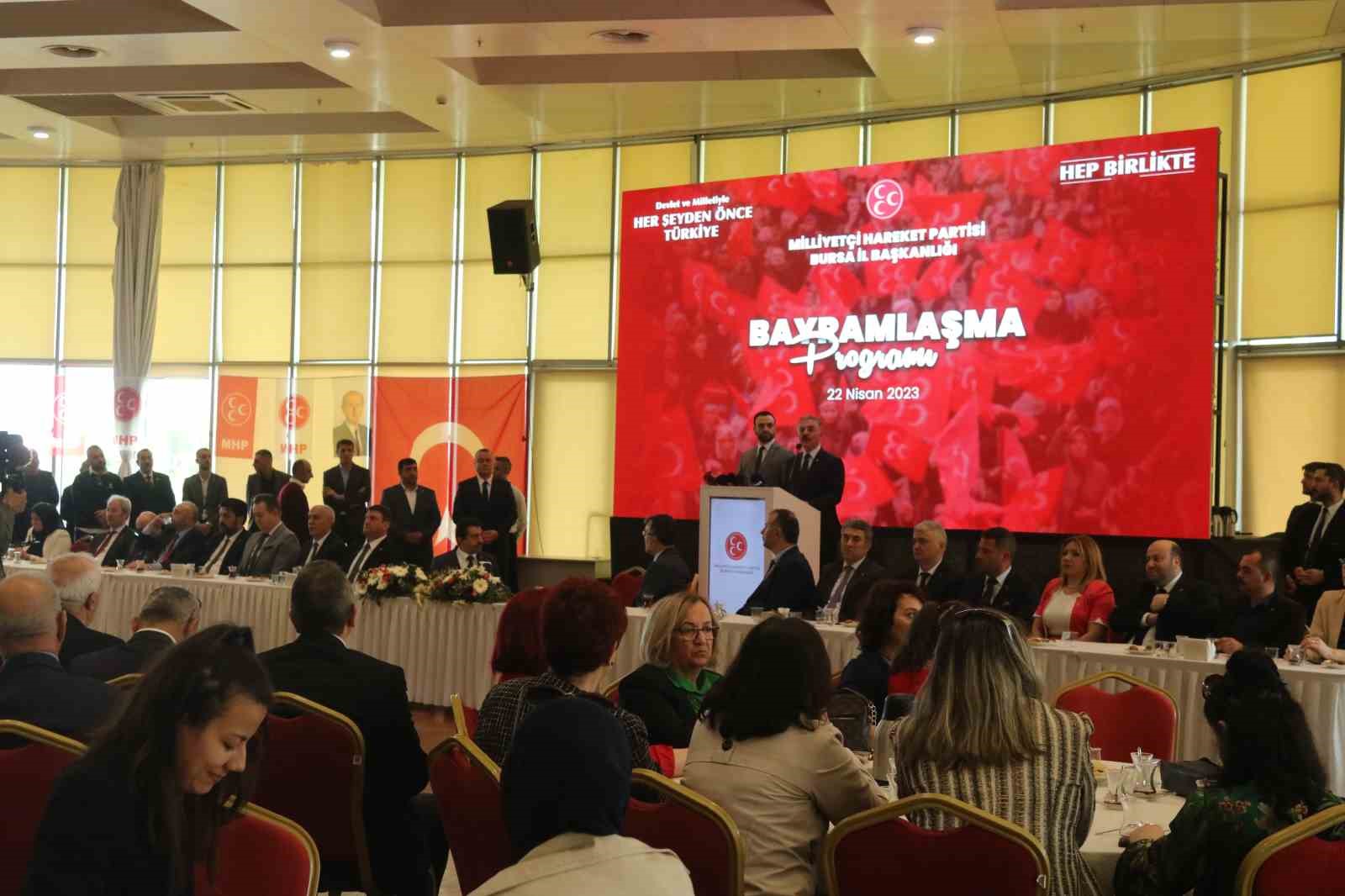 Programda konuşan MHP Bursa İl Başkanı Cihangir Kalkancı, “Milliyetçi Hareket Partisi gücünü Türk milletinden almaktadır. Milliyetçi Hareket Türkiye için vardır. Milliyetçi Hareket, Türk-İslam coğrafyalarının umudu olmak için vardır. Milliyetçi Hareket Türklüğün bekası için vardır. Milliyetçi Hareket Partisi büyük bir fikrin, onurlu bir tarihin, eşsiz bir kaynaşma kültürünün tezahürüdür. 54 yıldır hıyanetlere meydan okuduk. Yarım asırdır hezimetlere kafa tuttuk. Türk ve İslam’ın haysiyetini savunduk. Gün geldi bunaldık, gün geldi budandık. Gün geldi şehit, gün geldi şahit olduk. Ancak her dem taze, her dem var olmayı başardık. Gün oldu asırlara bedel olaylar yaşadık, Gün oldu kükremiş sel gibi bendimizi çiğneyip aştık. Bir şehit tabutunun altında göz pınarlarımızdan akan yaşlarla dertleştik. Ama Asla zulme boyun eğmedik, hainlere fırsat vermedik. Doğru bildiğimizi, Türk milletinin hasımlarının gözünün içine baka baka haykırmaktan çekinmedik” dedi.