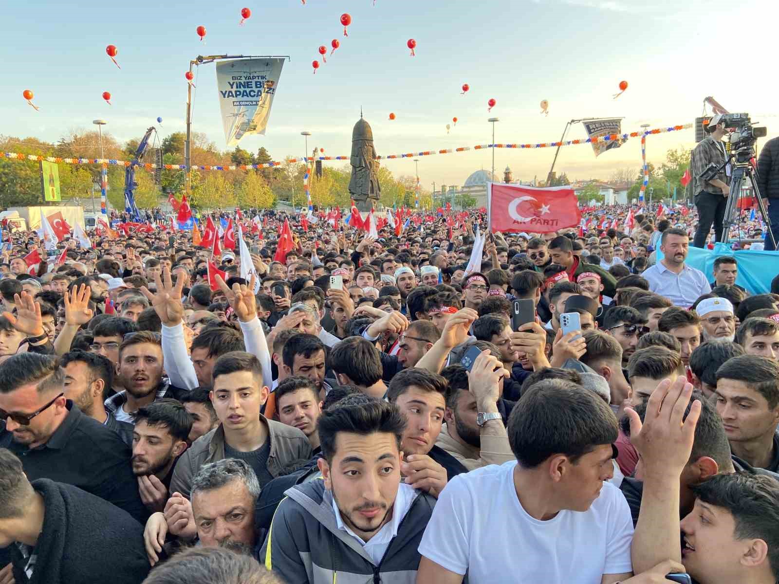 “Bu sandıkları 14 Mayıs’ta patlatacağımızdan hiç şüphem yok” diyen Cumhurbaşkanı Erdoğan, “Hepimiz bu dünyada faniyiz. Ne olacağımızı, ne ile imtihan olacağımızı kimse bilmiyor. Bakalım hangimiz daha isabetli bir imtihanda bulunacağız. Milletimize aşkla hizmet etmek bizim amacımız. Nerede nasıl öleceğimiz belli değil, ne makam ne de koltuk peşindeyiz. Biz bu millete efendi olmaya değil hizmetkar olmaya geldik. Bizim tek bir gayemiz vardır o da sizlerin hayır duasını almaktır. 21 yıldır gece gündüz demeden tüm Türkiye’ye aşkla hizmet ediyoruz. Konya’ya 168 milyar liralık kamu yatırımı yaptık. 2’si devlet 4 yeni üniversite kazandırdık. 28 bin kapasiteli yükseköğrenim yurt binaları açtık. 114 adet spor tesisi, sosyal yardımda 8,5 milyarlık kaynak aktardık. 34 hastane olmak üzere 108 sağlık binası yaptık. Çevre ve şehircilikte 28 bin 180 konut projesini hayata geçirdik. Şimdi de ilk evim ile 7 bin 655 konut daha yapıyoruz. İlk iş yerimle esnafımız için 500 iş yeri yapıyoruz. Arsalar veriyoruz. 18 millet bahçesi projemizden 10’unu tamamladık. Kalanların yapımı sürüyor. Ankara-Konya, Konya-Karaman yüksek hızlı tren hatlarını hizmete açtık. Konyaray hizmetimiz ile ilgili çalışmalar sürüyor. Havalimanına yıllık 3 milyon yolcu kapasiteli terminal binası yaptık. 25 baraj, 2 içme suyu, 41 gölet, 6 yer altı depolama tesisi yaptık” şeklinde konuştu.