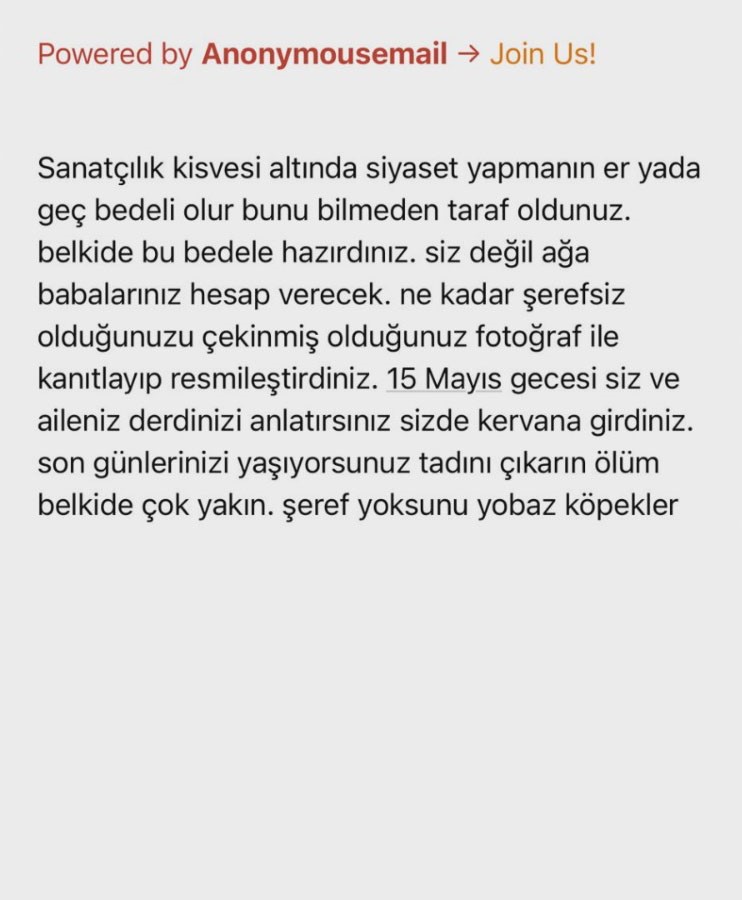 “Cumhurbaşkanımızın yanında olduk, Ankara’da düzenlenen Büyük Ankara Mitingi ve milli muharip uçağımız Kaan’ın tanıtım törenine katılıp Cumhurbaşkanımız ile fotoğraf paylaştık diye bizi tehdit ediyorlar” diyen Seko ve Tefo, “Sosyal medya hesaplarımızdan Cumhurbaşkanımız ile çektiğimiz fotoğraflarımızı paylaştık, katıldığımız etkinliklerin görüntülerini attık. Bu görüntüler milyonlarca kişiye ulaştı. Daha sonra sosyal medya üzerinden bize değişik sorular gelmeye başladı. Biz bu sorulara kulak asmadık. Dün akşam 18.30-19.00 saatleri arasında bize arka arkaya mailler gelmeye başladı. Bu maillerde ailemize ve şahsımıza yönelik ölüm tehditleri yer alıyor. Biz asla davamızdan vazgeçmeyeceğiz. Özgürlük, hak, adalet diyorlar bize tehdit mesajları atıyorlar. Bu mesajlar bizi tedirgin etse de bu tehditlere pabuç bırakacak insanlar değiliz. Cumhurbaşkanımıza olan düşmanlıkları artık gözlerini karartmış. Kendisine ‘diktatör’ diyorlar, yaptıkları en büyük diktatörlük farkında değiller” diye konuştular.