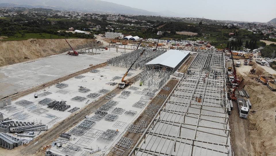 Kahramanmaraş merkezli depremlerden en çok etkilenen Hatay’da hem depremin yaraları sarılıyor hem de yeni projeler hızla yükseliyor. Depremin ardından Hatay’ın Defne ilçesine bağlı Bostancık Mahallesi’nde yapımına başlanan Defne Devlet Hastanesi’nde çalışmalar hızla sürüyor. 80 yoğun bakım yatağıyla, 12 ameliyathanesiyle, tüm branşlarda hizmet verebilecek bir donanıma sahip olacak hastanede inşaatında 700 işçi çalışıyor. Zemin çalışmalarının ardından mantolama işlemine geçen işçiler, kısa sürede çatı alanına kadar geldi. Hastanenin acil servis kısmının çatısını tamamlamak üzere olan işçiler, hastaneyi kısa sürede tamamlamak için gece gündüz çalışmalarını sürdürüyor.