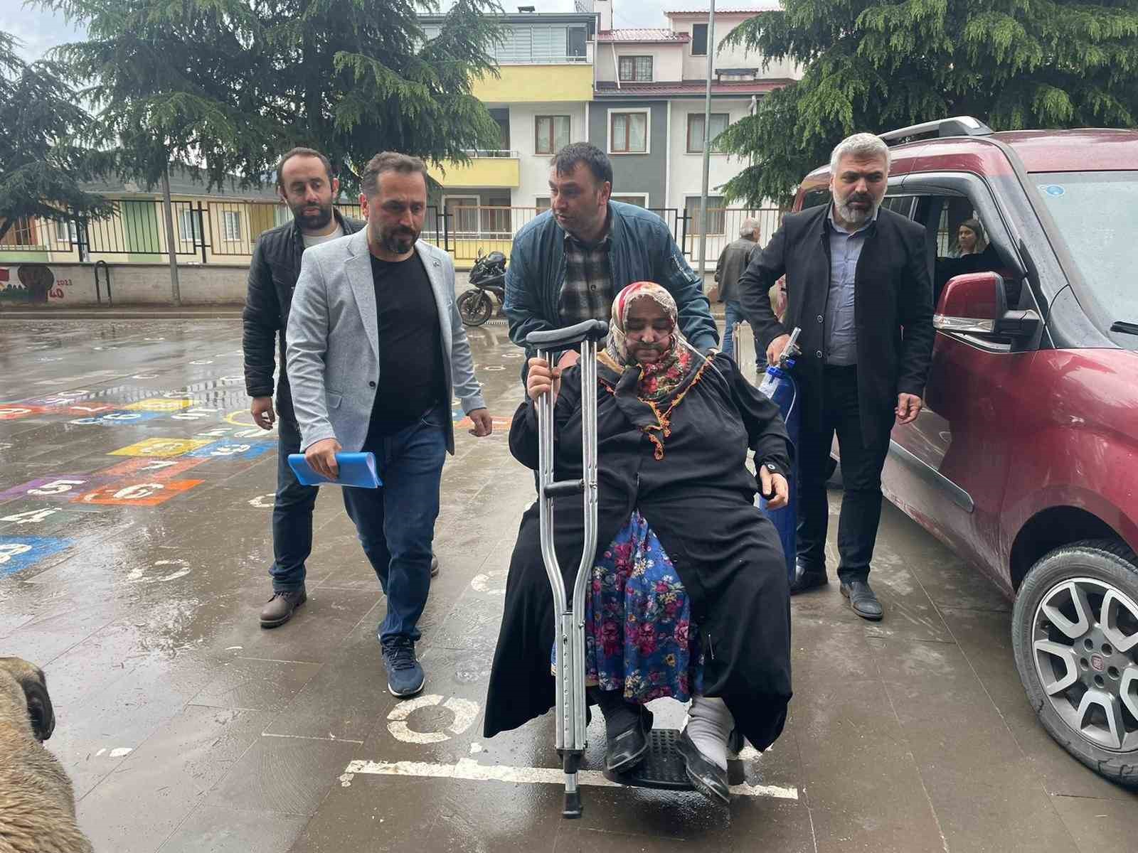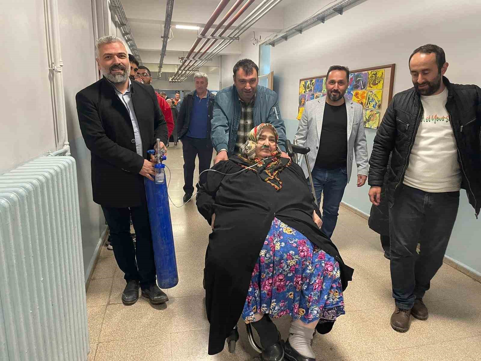 Artvin’de 61 yaşındaki KOAH hastası kadın tekerlekli sandalyesi ile beraberindeki oksijen tüpüyle oy kullanmaya geldi.