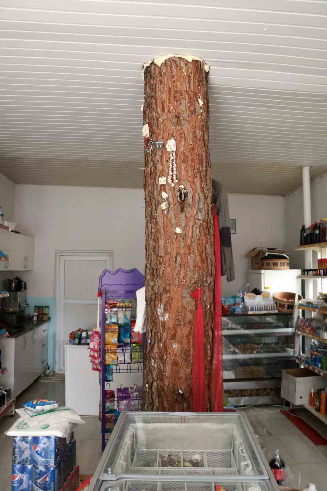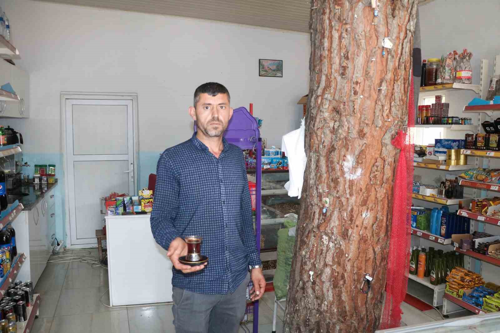 Kahramanmaraş’ta bir bakkal dükkanının yapımı sırasında kesilmeyen çam ağacının iş yerinin ortasından geçmesi dikkat çekiyor.