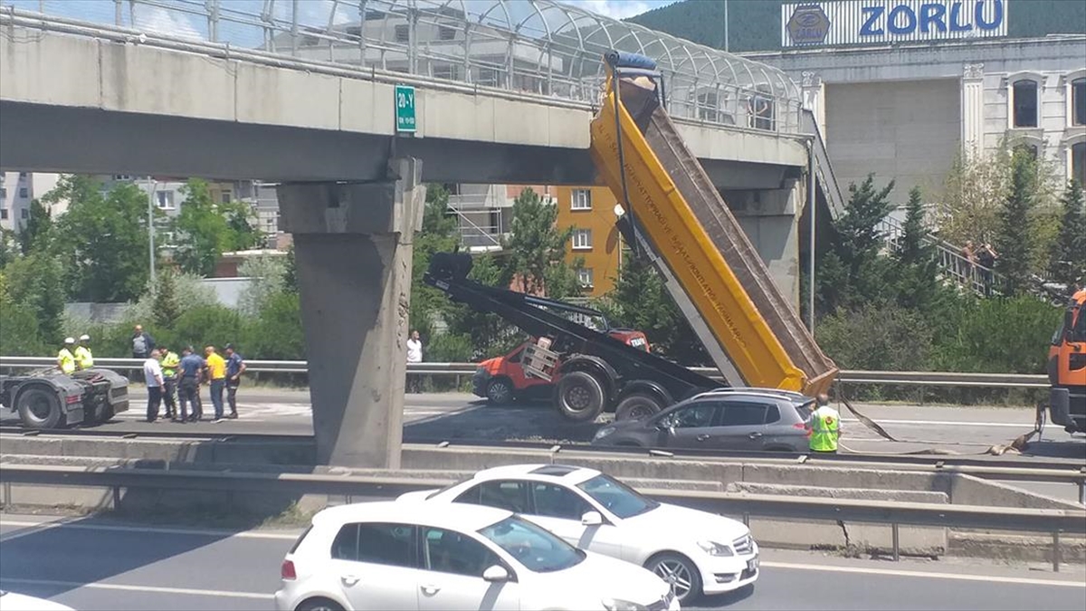 İSTANBUL (AA) – TEM otoyolundan Edirne istikametine giden, sürücüsünün ismi öğrenilemeyen 34 FK 806 plakalı hafriyat kamyonunun damperi, Sultanbeyli mevkisinde açıldı. Damperin üst geçide çarpması sonucu, kamyonun dorsesi ayrıldı, üst geçitte de hasar oluştu.