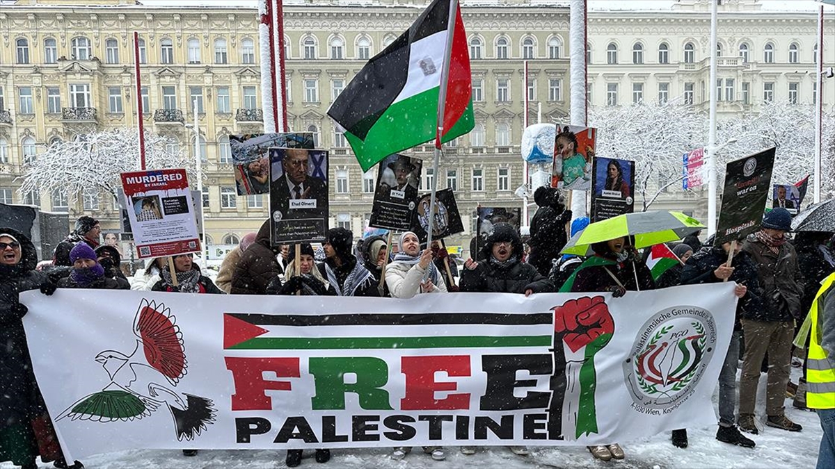 VIYANA (AA) – Yoğun kar yağışı ve soğuk havaya rağmen başkentin önemli noktalarından Mariahilfer Strasse’de toplanan göstericiler, Filistin bayraklarının yanı sıra “Gazze’de soykırım dursun”, “Hemen ateşkes” ve “Özgür Filistin” yazılı pankartlar taşıdı.