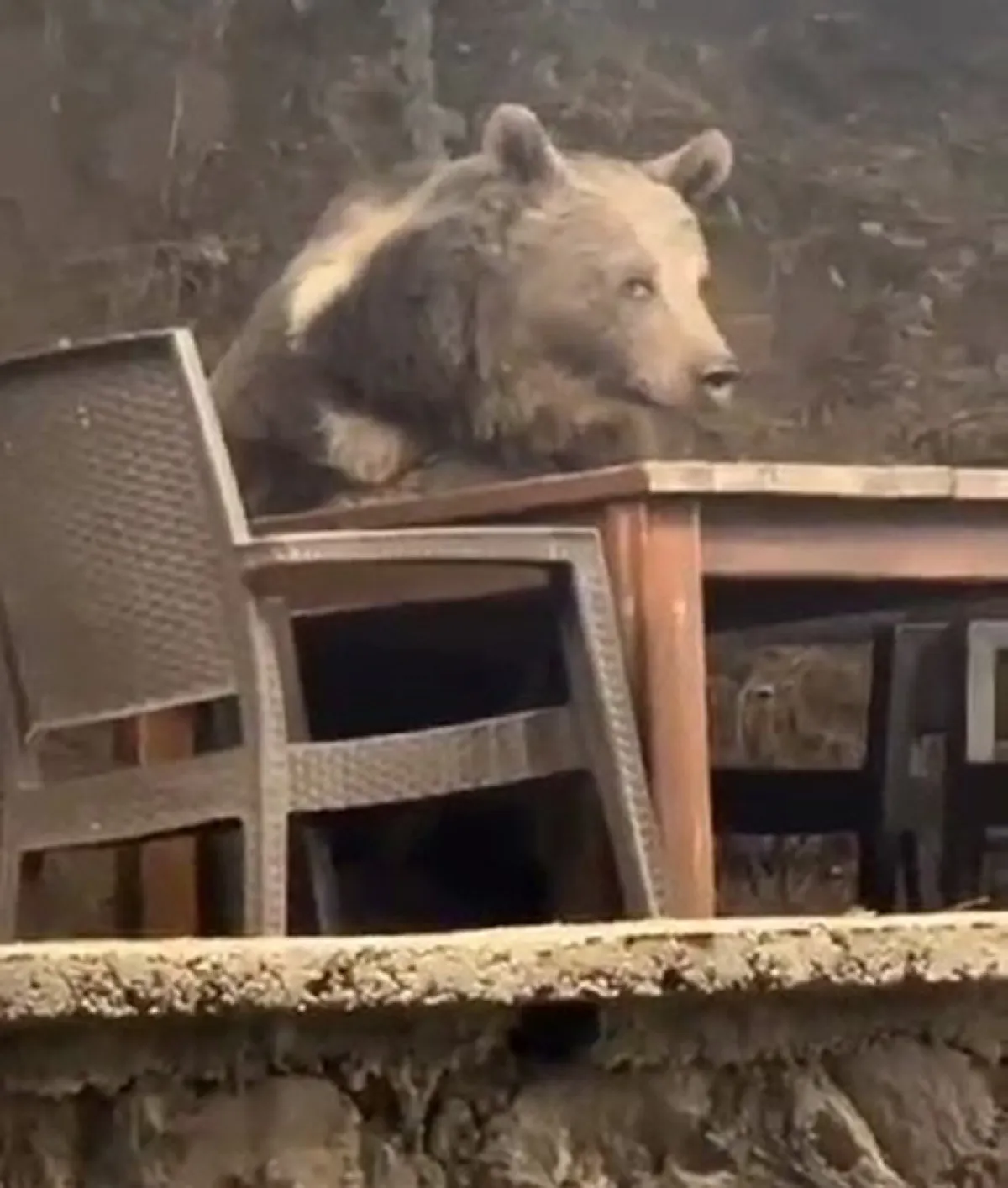 Masaya oturarak adeta servis yapılmasını bekleyen ve masadaki artıkları yiyen ayı, bir süre oturduktan sonra ormanın derinliklerinde kayboldu.