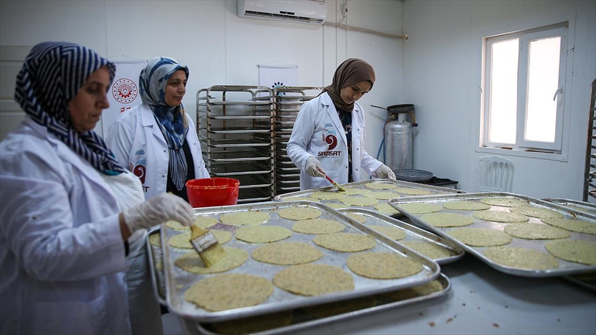 İpekyolu Samsat “Samsat Çöreği” Geçim Kaynağı Tesisi’nde istihdam edilen 12 kadın, içerisinde un, rezene, susam, çörek otu, tuz, bitkisel susuz yağ ve sarı gelin otu kullanarak üretime başladı.