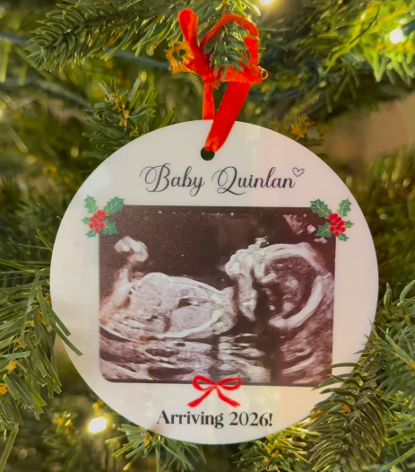 Ağaç süsünde bebeğin ultrason fotoğrafı yer alıyordu ve üzerinde “Bebek Quinlan: 2026’da geliyor” yazıyordu.