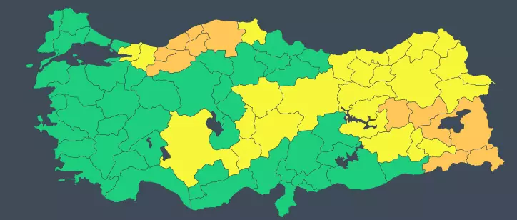Sarı Kod (26 İl): Ağrı, Artvin, Diyarbakır, Elazığ, Erzincan, Erzurum, Giresun, Gümüşhane, Kars, Kayseri, Konya, Kocaeli, Nevşehir, Niğde, Rize, Sakarya, Siirt, Sinop, Sivas, Trabzon, Tunceli, Yozgat, Bayburt, Batman, Ardahan, ve Iğdır’da “potansiyel tehlike” uyarısı yapılarak buzlanma ve dona karşı dikkatli olunması istendi.
