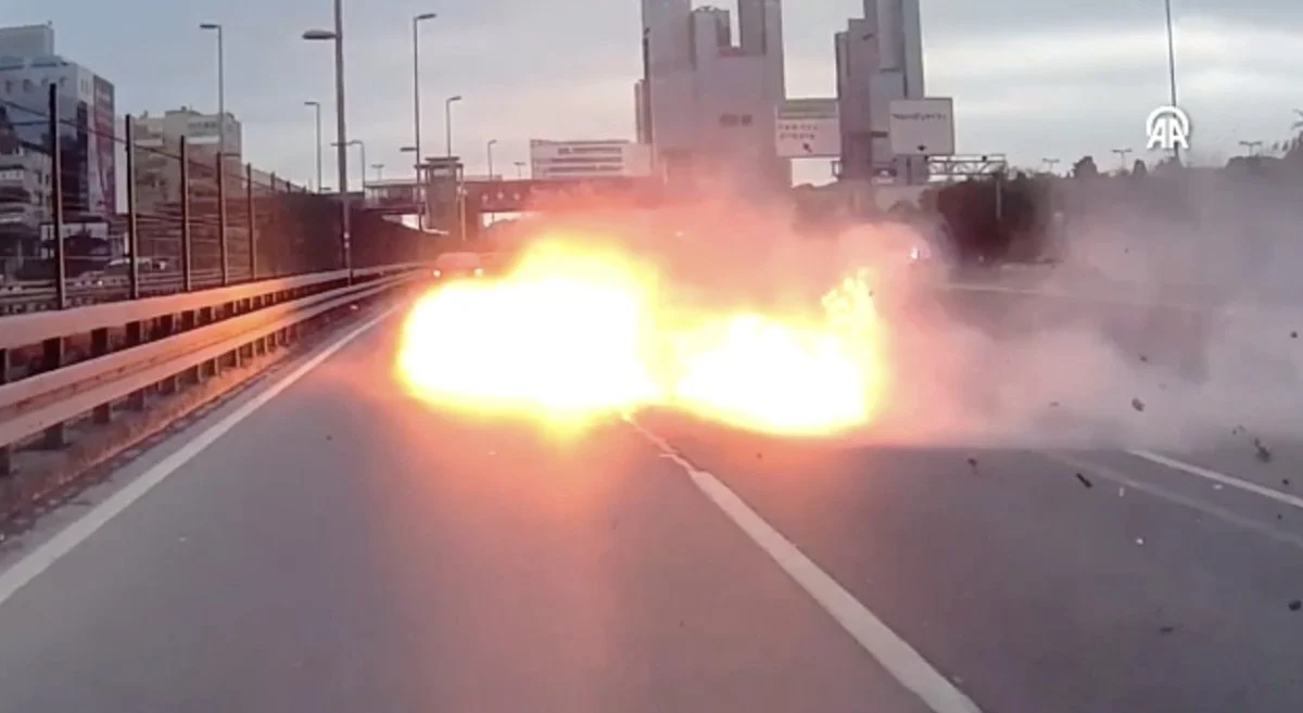 Başka bir aracın kamerasınca kaydedilen görüntülerde, şerit değiştiren otomobilin önce bariyerlere çarpması, daha sonra motorundan alevlerin yükselmesi yer alıyor.
