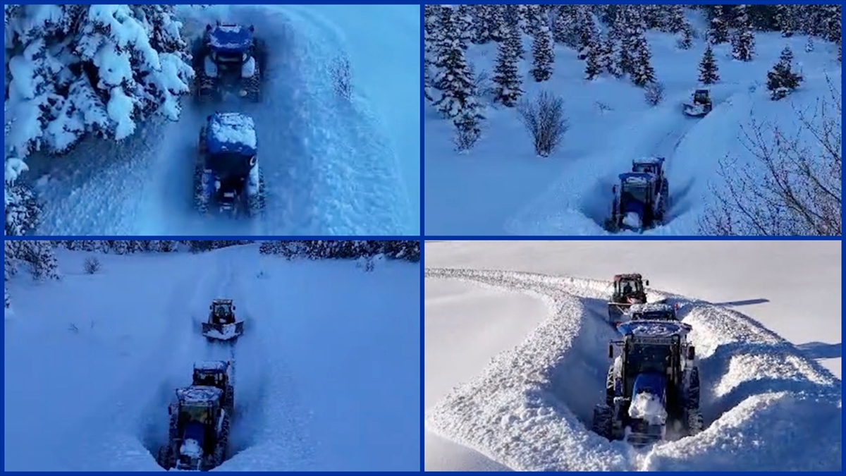 Sezer, arka arkaya bağladığı traktörlerle karlı yolları açarken çektiği görüntüleri sosyal medyasında paylaştı.