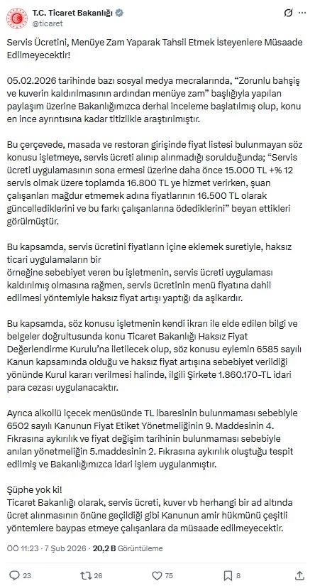 5 Şubat tarihli bazı sosyal medya mecralarında, “Zorunlu bahşiş ve kuverin kaldırılmasının ardından menüye zam” başlığıyla yapılan paylaşımlara dair ise Ticaret Bakanlığı harekete geçti. Bakanlık, inceleme başlatıldığını ve titizlikle araştırmanın yürütüldüğünü belirtti.