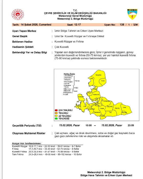 İzmir’de yarın sabah saatlerinden itibaren etkili olması beklenen fırtına, kentin çeşitli bölgelerinde çeşitli risklere yol açabilir. Meteoroloji 2. Bölge Müdürlüğü tarafından yapılan ve İzmir Valiliği tarafından paylaşılan açıklamada işte bu uyarılar yer aldı…
