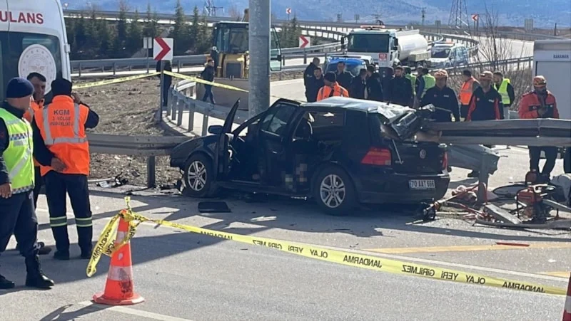 Karaman’da kontrolden çıkan otomobilin demir bariyerlere ok gibi saplanması sonucu meydana gelen feci kazada karı-koca olay yerinde yaşamını yitirirken, 3 yaşındaki kızları yaralandı.