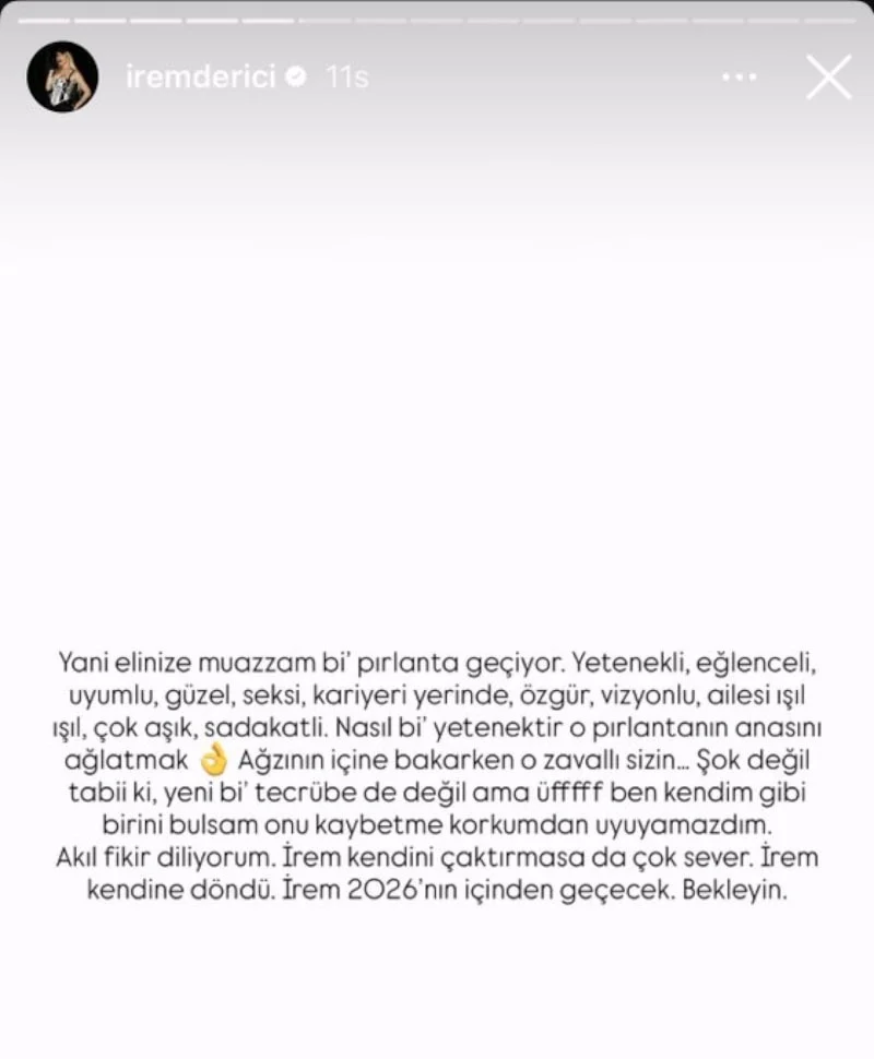 Derici paylaşımında, “Yani elinize muazzam bi’ pırlanta geçiyor. Yetenekli, eğlenceli, uyumlu, güzel, seksi, kariyeri yerinde, özgür, vizyonlu, ailesi ışıl ışıl, çok aşık, sadakatli. Nasıl bi’ yetenektir o pırlantanın anasını ağlatmak. Ağzının içine bakarken o zavallı sizin… Şok değil tabii ki, yeni bi’ tecrübe de değil ama üfffff ben kendim gibi birini bulsam onu kaybetme korkumdan uyuyamazdım. Akıl fikir diliyorum. İrem kendini çaktırmasa da çok sever. İrem kendine döndü. İrem 2026’nın içinden geçecek. Bekleyin.” ifadelerini kullandı.
