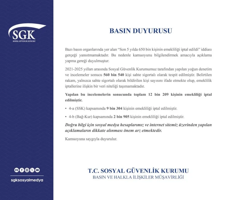 SGK, yayımladığı mesajında “Bazı basın organlarında yer alan ‘Son 5 yılda 650 bin kişinin emekliliği iptal edildi’ iddiası kesinlikle gerçeği yansıtmamaktadır. Yapılan denetim ve incelemeler sonucunda son 5 yılda toplam 12 bin 209 kişinin emekliliği iptal edilmiştir.” dedi.